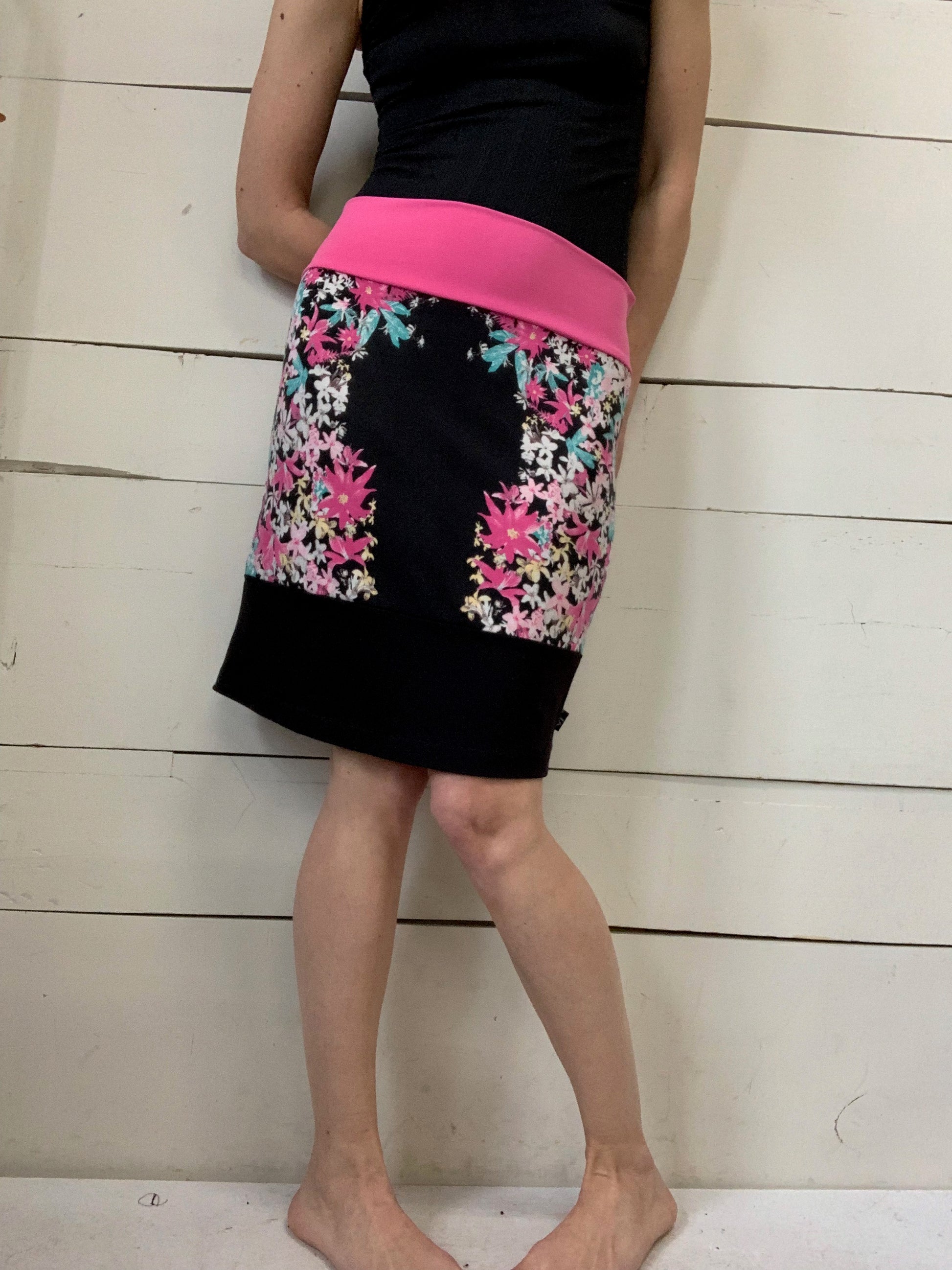 Jupe droite très belle rose et noir avec motifs floraux. Très extensible, elle est parfaite pour les saisons estivals. Conçu uniquement à partir de tissus recupérés, sa confection la rend tout à fait incomparable. Les Mollets Frisquets fabrique uniquement des produits exclusifs