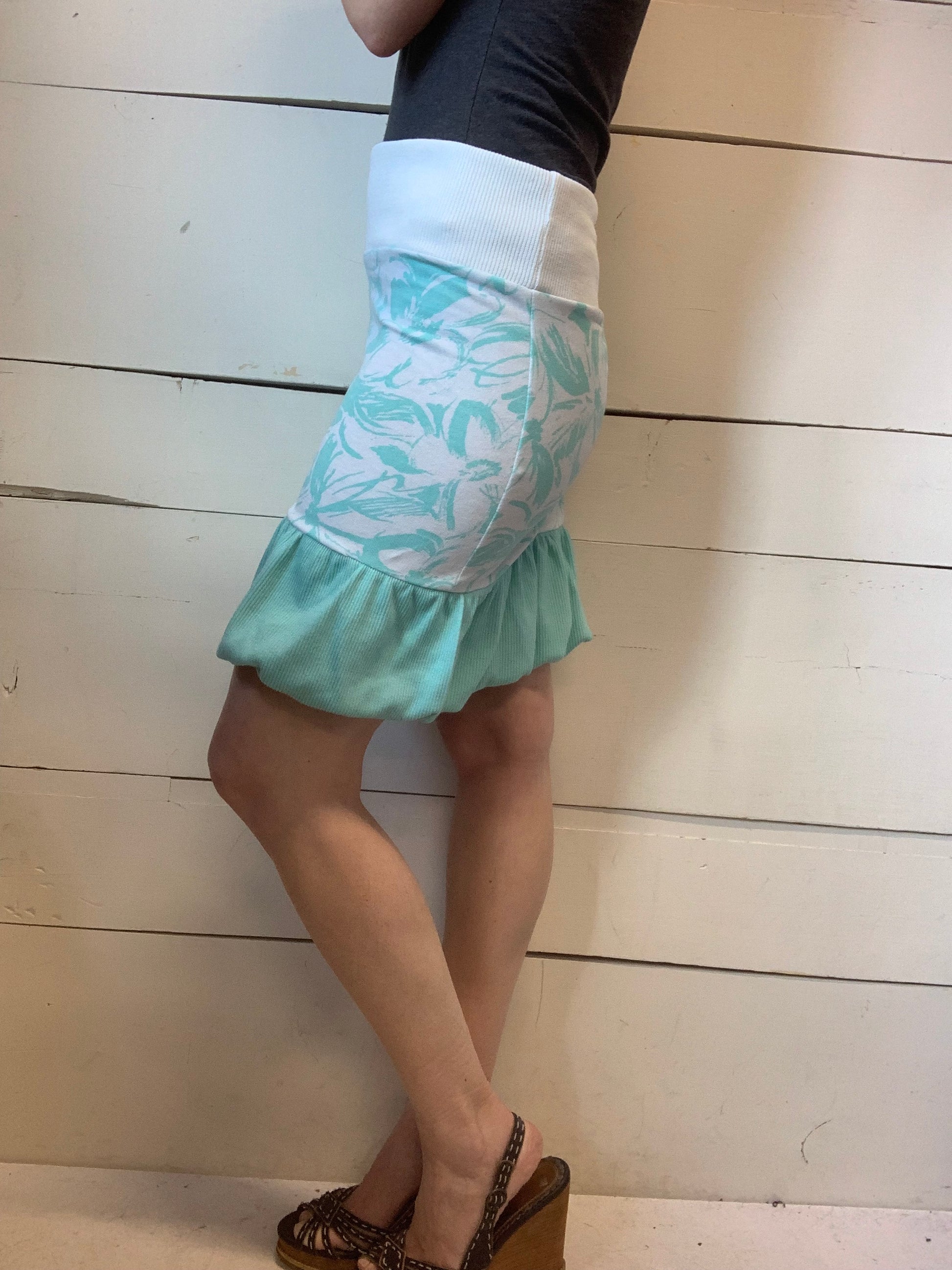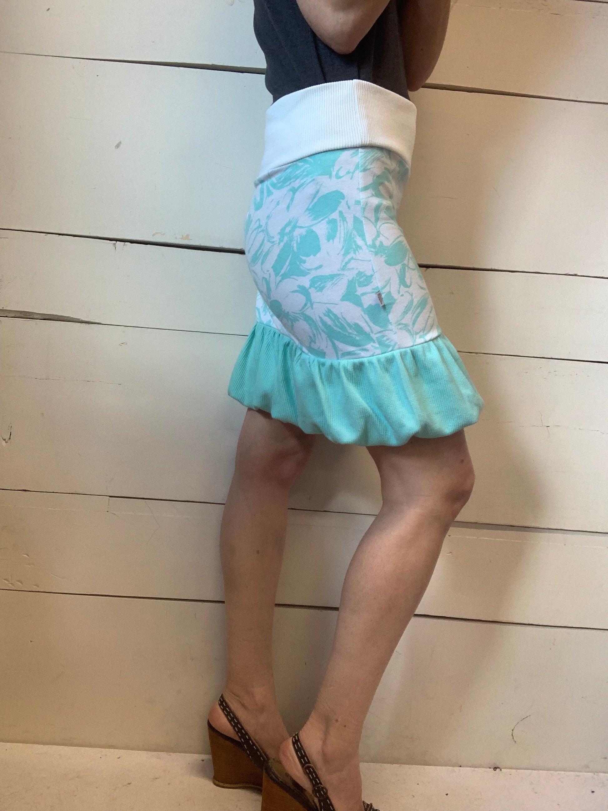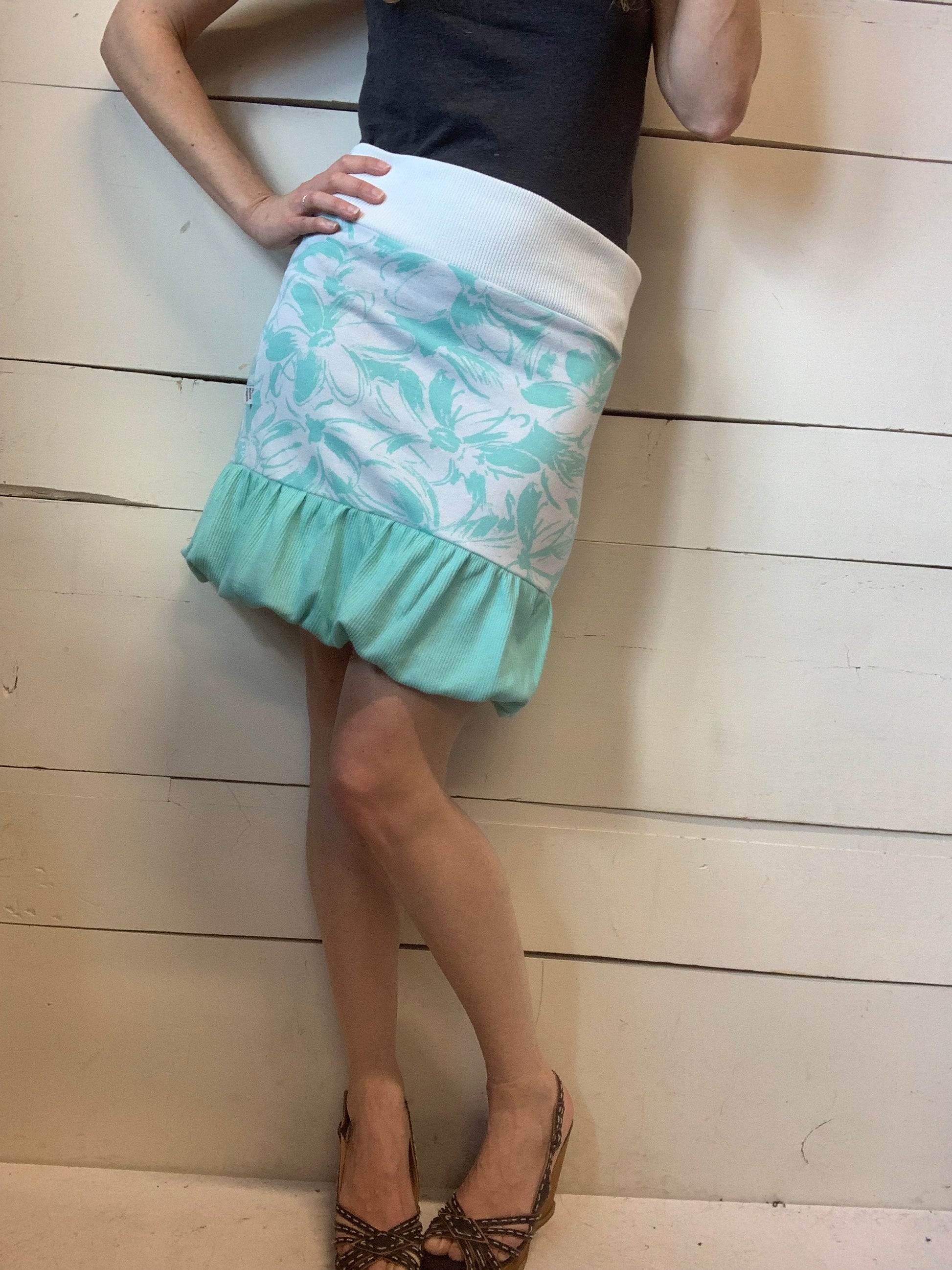 Jupe blanche et pastel vert avec PUFF PASTEL, tout à fait unique et confortable. Très extensible, elle est parfaite pour les saisons estivals. Conçu uniquement à partir de tissus recupérés, sa confection la rend tout à fait incomparable. Les Mollets Frisquets fabrique uniquement des produits exclusifs