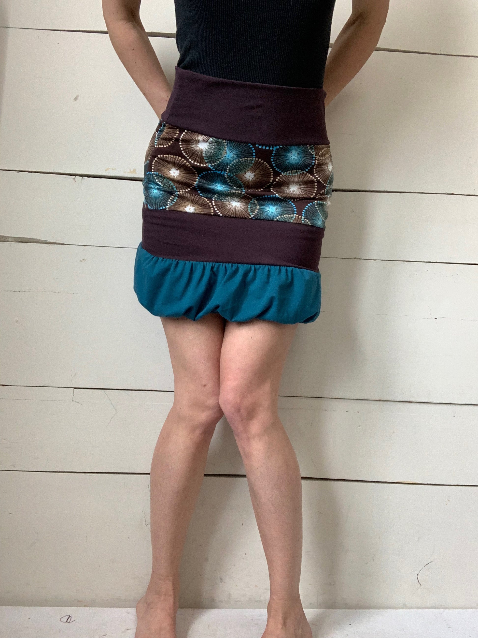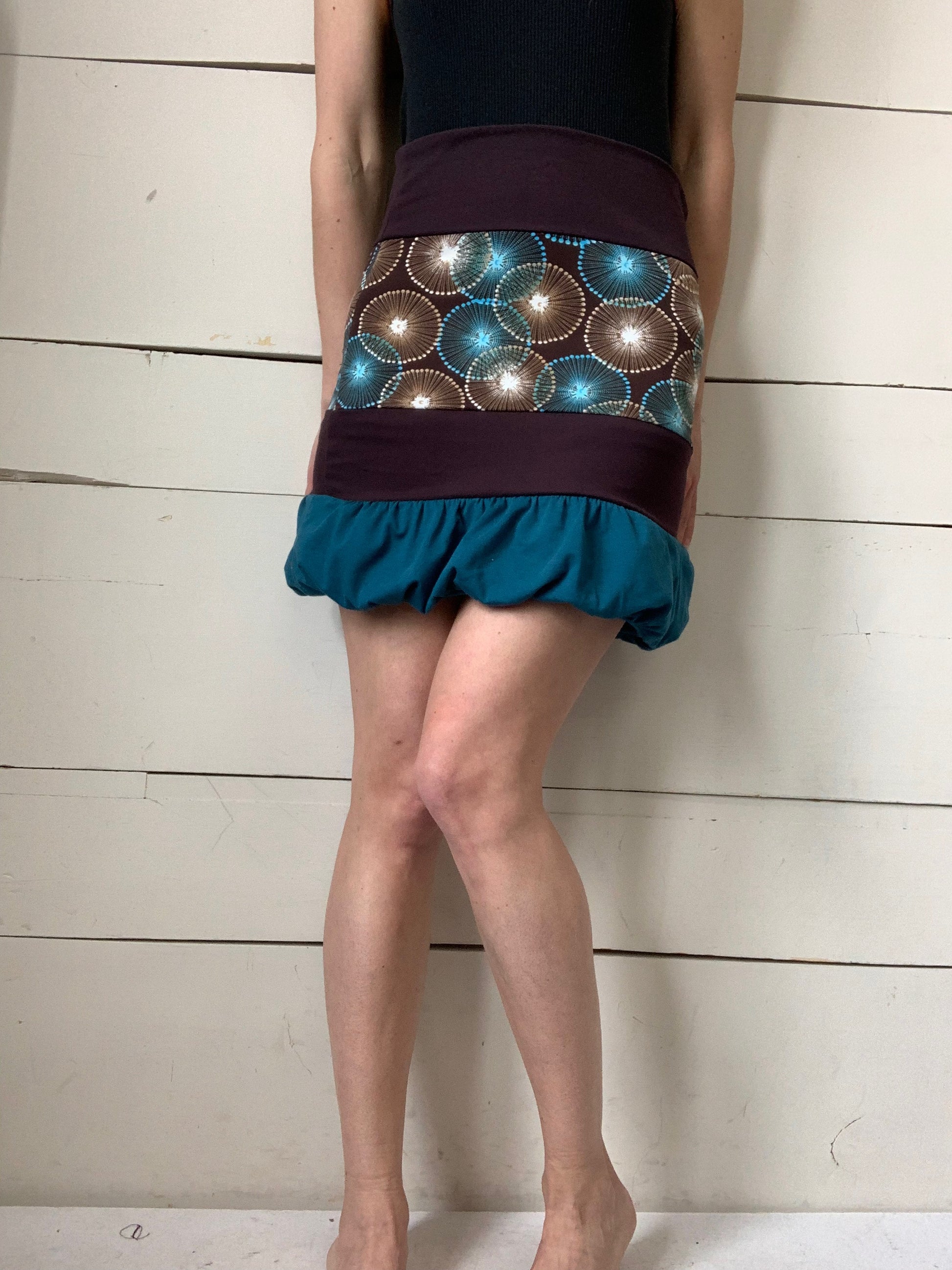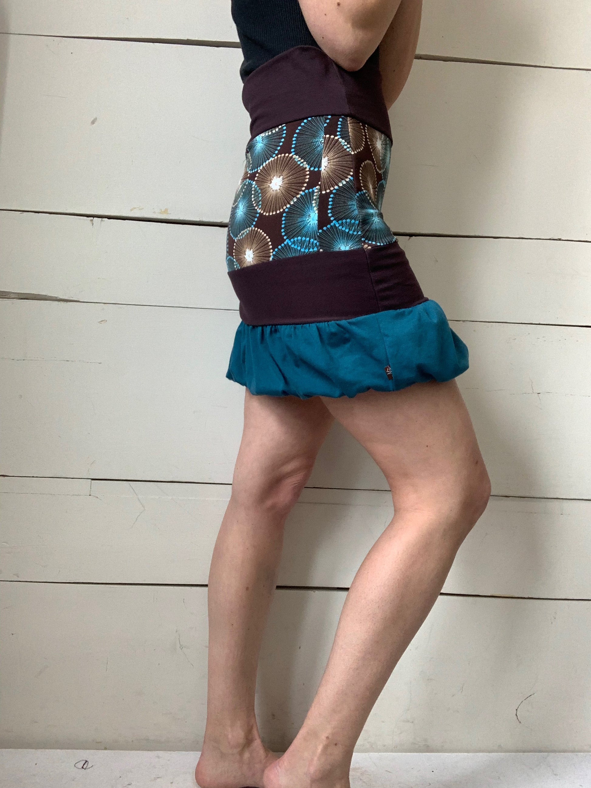 Jupe dans les tons de brun et turquoise avec motifs de feux d'artifices, tout à fait unique et confortable. Très extensible, elle est parfaite pour les saisons estivals. Conçu uniquement à partir de tissus recupérés, sa confection la rend tout à fait incomparable. Les Mollets Frisquets fabrique uniquement des produits exclusifs