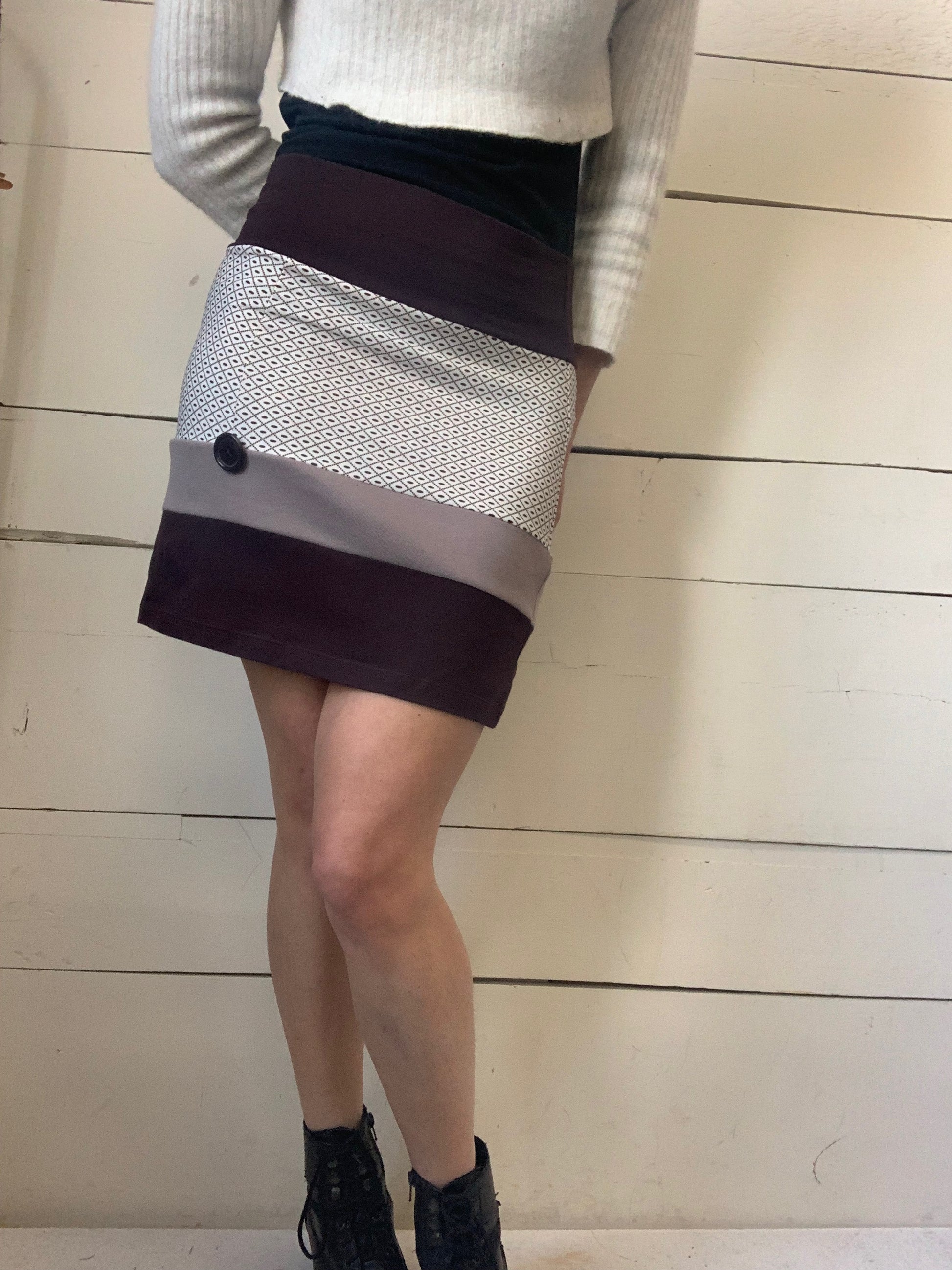Jupe droite crème et brune avec boutons. Elle est parfaite pour les saisons estivals. Conçu uniquement à partir de tissus recupérés, sa confection la rend tout à fait incomparable. Les Mollets Frisquets fabrique uniquement des produits exclusifs