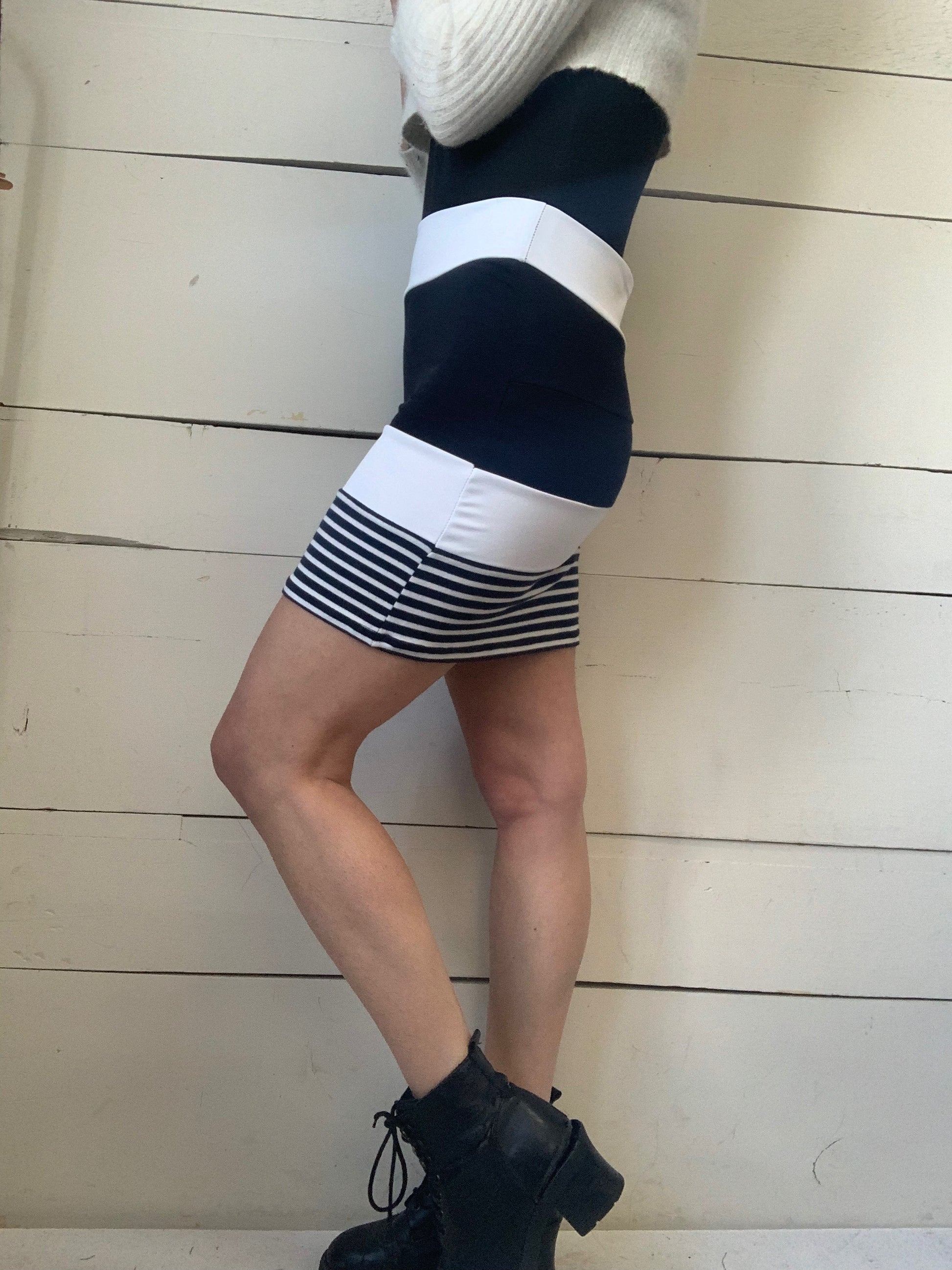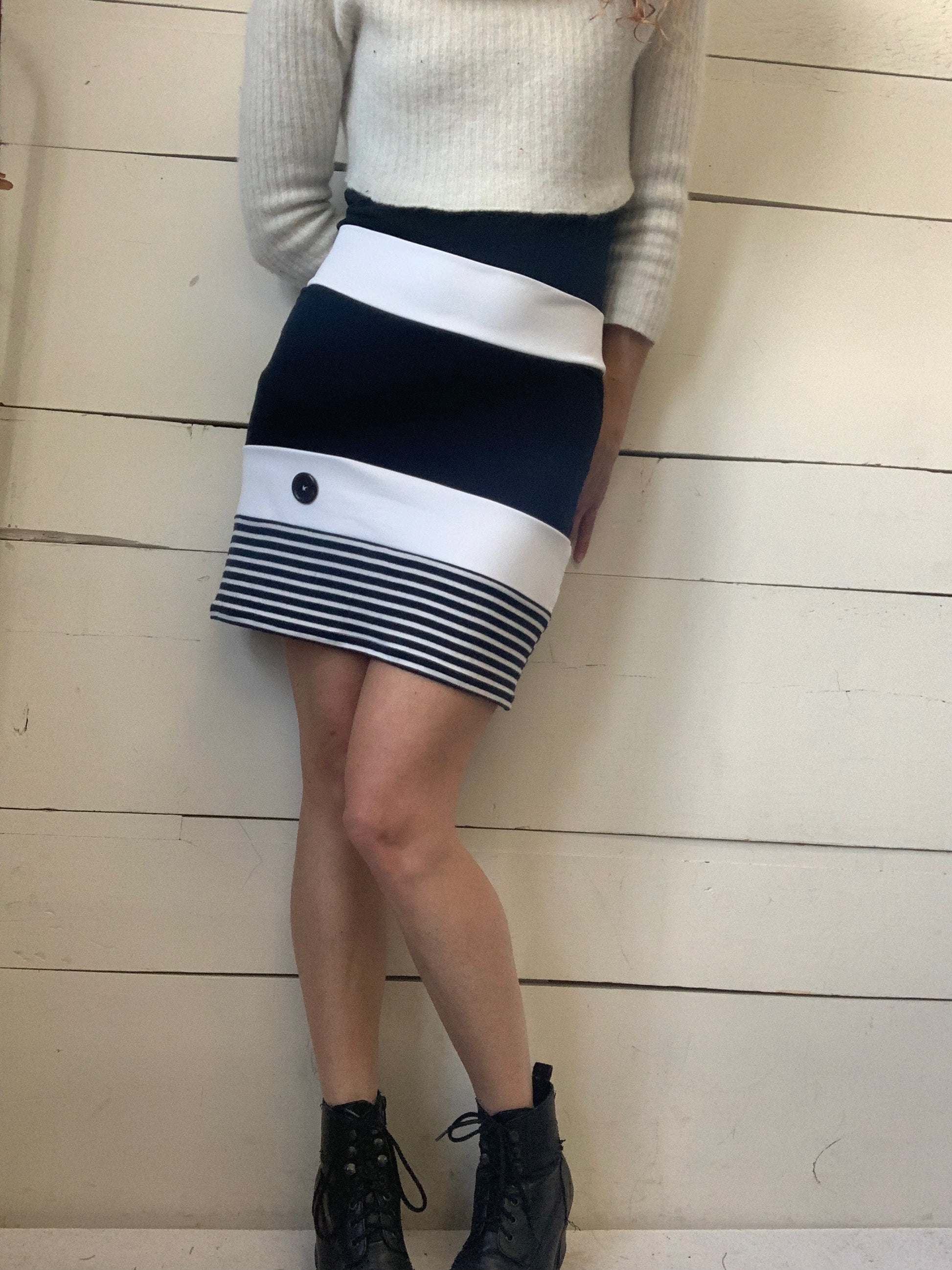 Jupe droite blanche, marine et bouton tout à fait unique. Elle est parfaite pour les saisons estivals. Conçu uniquement à partir de tissus recupérés, sa confection la rend tout à fait incomparable. Les Mollets Frisquets fabrique uniquement des produits exclusifs