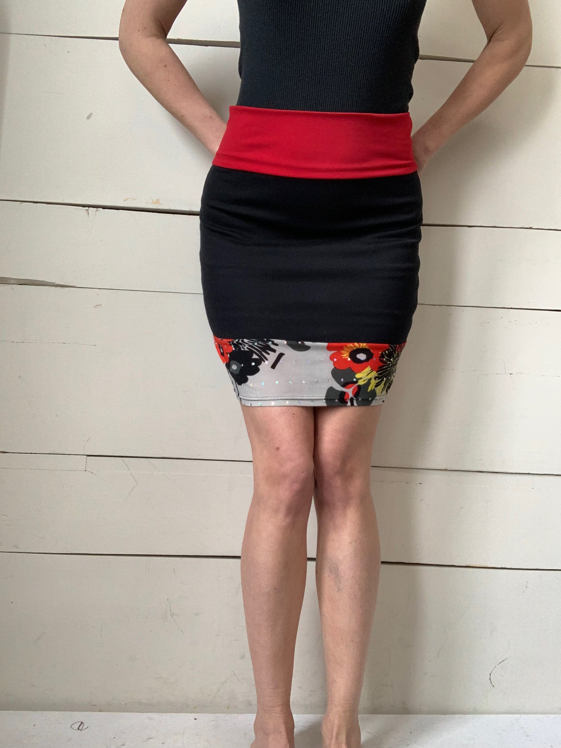 Jupe principalement noir avec motifs floraux rouge, tout à fait unique. Très extensible, elle est parfaite pour les saisons estivals. Conçu uniquement à partir de tissus recupérés, sa confection la rend tout à fait incomparable. Les Mollets Frisquets fabrique uniquement des produits exclusifs